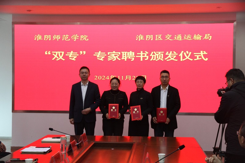 云顶国际yd222线路检测中心季秀平教授、林华东教授、谢雨副教授、张月霞副教授等四位老师被聘为“双专”专家库成员。此举标志着淮安市交通运输系统首支“双专”专家队伍正式组建。严健局长为受聘专家颁发了聘书。