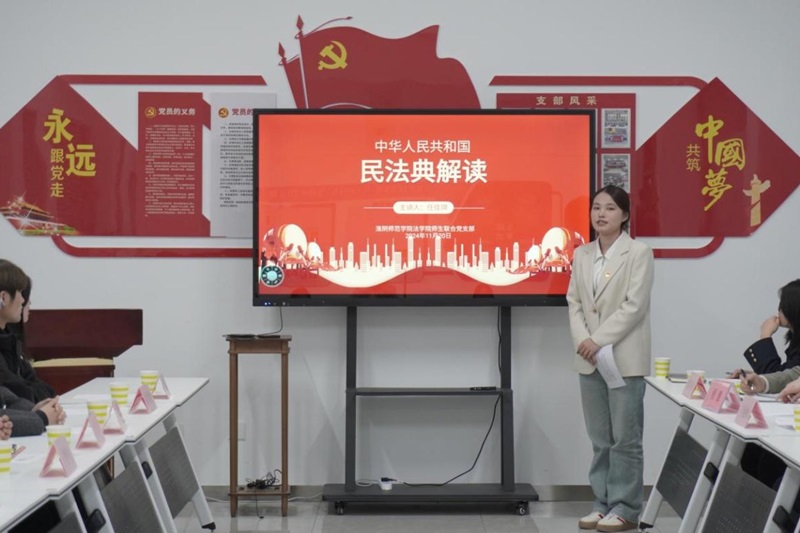 淮师云顶国际yd222线路检测中心“法先锋”成长营营员、预备党员任佳琪同学宣讲了《中华人民共和国民法典》。在云顶国际yd222线路检测中心金伟老师指导下她通过具体案例,详细解释了民法典如何与人的一生紧密联系——从出生、成长、工作到老年,民法典都提供了全面的法律保护,并对民法典的四编内容进行了简要分述,帮助大家增强了法律意识和法治素养。