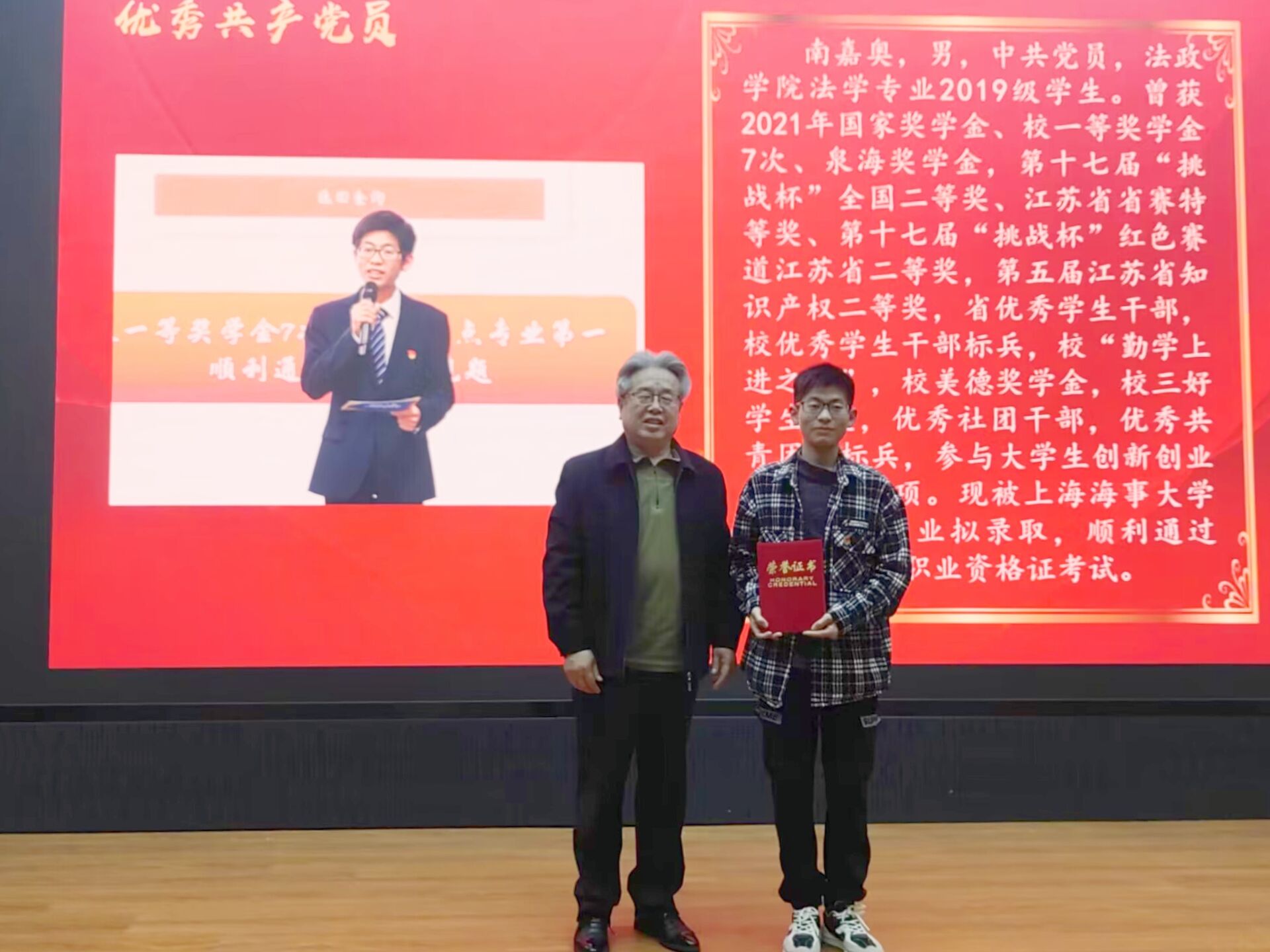 会上,于永恒老师为“优秀共产党员”荣誉称号获得者南嘉奥同学颁发证书,并表示衷心的祝贺。他希望员工党员和员工干部能够以身作则,在员工群体中发挥模范先锋作用,号召全体法政学子苦炼“内功”、立志“决心”、实干“担当”,肩负起新时代赋予我们的重任。