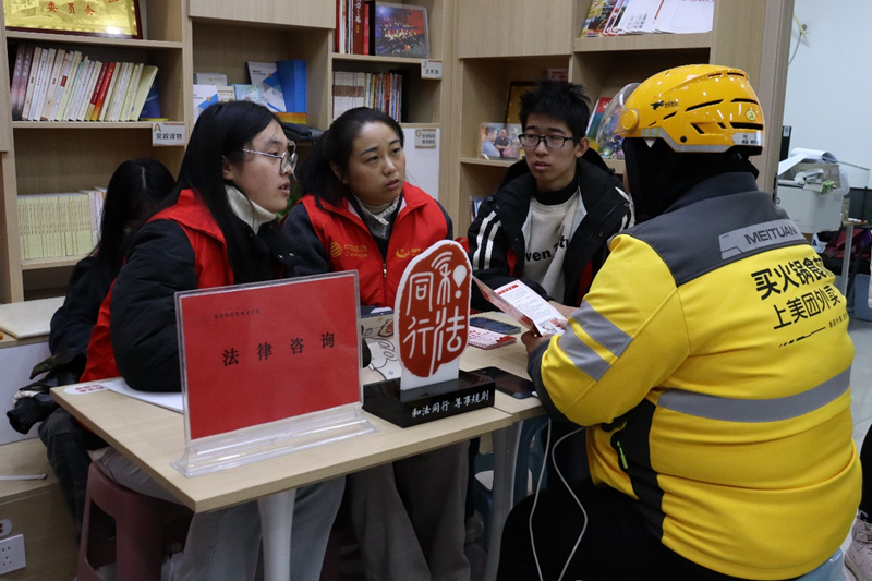 活动现场还设置了免费法律咨询点,外卖员与居民针对自身遇到问题进行现场咨询,志愿者耐心解答并提出维权建议。
