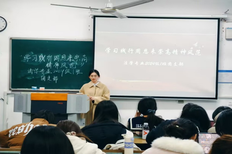 为了深入学习周恩来总理的崇高精神、高尚品德和伟大风范,使同学们深刻领会周恩来精神的内涵与价值,2025年3月22日,云顶国际yd222线路检测中心2401班在法政楼教室开展了“学习践行周恩来崇高精神风范”主题团日活动。团支书林洁同学主持本次活动。
