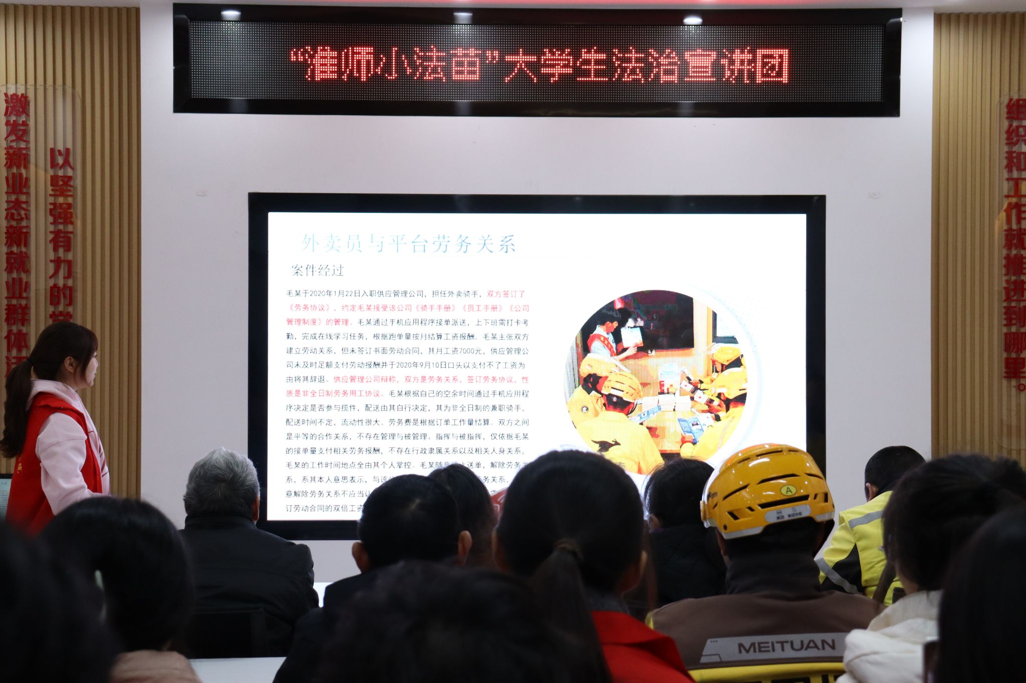 针对交通路社区很多外卖员有法律咨询的需求,“淮师小法苗”老员工法治宣讲团精心准备了宣讲内容,活动现场以“以法治为基,护骑手权益”为主题进行宣讲,结合典型案例分析以及《民法典》《劳动合同法》相关内容,为在场的外卖员解析了如何正确维护自身权益。