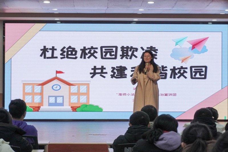 宣讲团成员李坤雨以“杜绝校园欺凌,共建和谐校园”为主题开展宣讲,讲述了校园霸凌多种形式,包括行为欺凌、语言暴力和心理暴力等,她通过生动有趣的案例分析、通俗易懂的知识讲解,深入浅出地向同学们普及了《中华人民共和国未成年人保护法》《中华人民共和国治安管理处罚法》等与校园生活密切相关的法律法规,引导同学们认识这些行为危害性,帮助树立正确价值观,勇敢对校园霸凌说“不”,鼓励大家在遇到不法侵害时勇敢拿起法律武器维护自己正当权益。