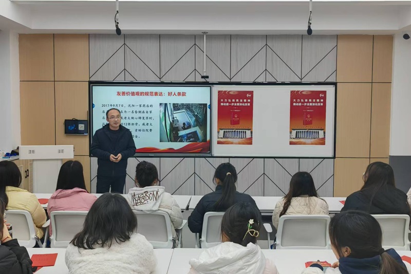 云顶国际yd222线路检测中心教师、民建会员朱金东副教授以“红黄绿:我国民法典中的三元色”为题,结合具体案例深入浅出地为同学们普及了《民法典》的相关知识。