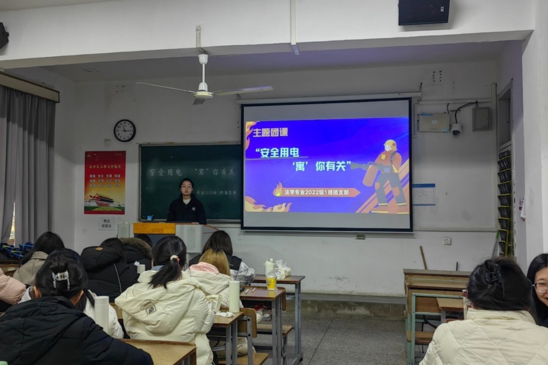 团课伊始,鞠欣雨讲述了近期高校出现的宿舍火灾事故的例子。经过她的介绍,同学们认识到了宿舍用电安全的重要性。随后,她邀请班级同学分享宿舍用电有哪些安全隐患,提醒同学们要规范用电。最后,鞠欣雨科普了一些用电安全小知识,再次强调每位同学都要安全用电,让同学们牢记防火措施和避火对策。