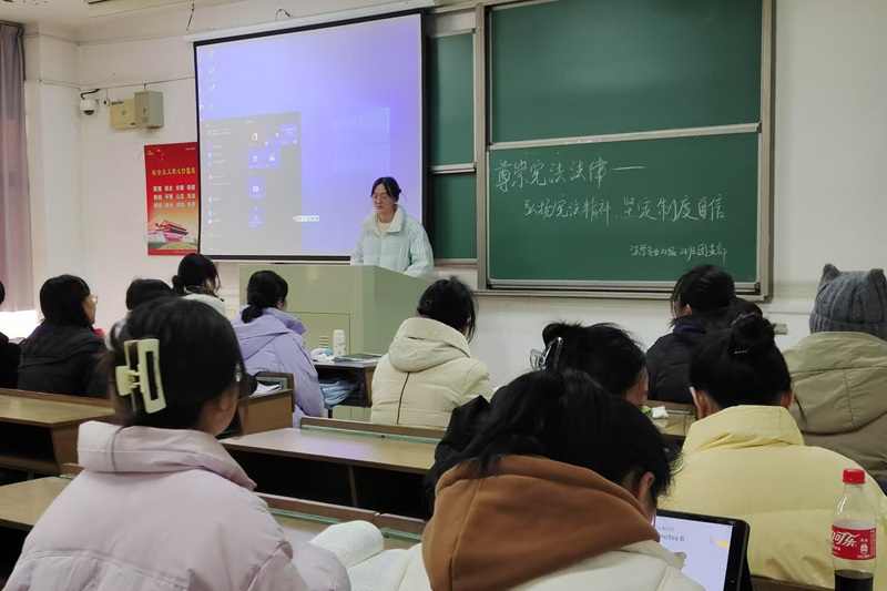 为了深入学习贯彻习近平法治思想,引导同学们学习宪法知识,弘扬宪法精神,维护宪法权威,做宪法的忠实崇尚者、自觉遵守者、坚定捍卫者,2024年12月19日,法学专业2022级2班团支部开展“尊崇宪法法律—弘扬宪法精神 坚定制度自信”主题团日活动。团支书陈熺同学主持本次活动。