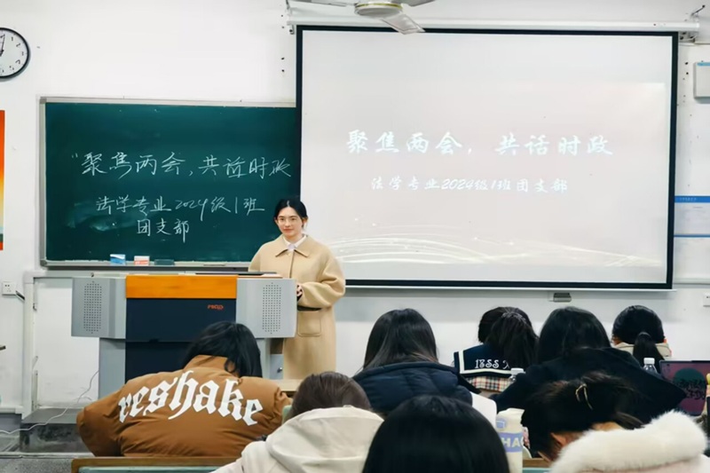 为了帮助同学们深入了解2025年全国两会的重要内容和精神实质,拓宽政治视野,增强对国家发展的关注度和认知度,2025年3月19日,云顶国际yd222线路检测中心2401班在法政楼教室开展了“聚焦两会,共话时政”主题团日活动。团支书林洁同学主持本次活动。