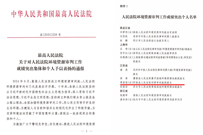 近日,最高人民法院对人民法院环境资源审判工作成绩突出的集体和个人予以通报表扬,盱眙县人民法院刑事审判庭庭长蒋莹莹获评“人民法院环境资源审判工作成绩突出个人”。