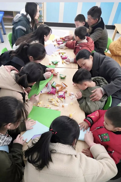 志愿者们教孩子折纸,分享小零食。有的孩子在纸上写字,然后展示给身边的志愿者。“你很棒!”志愿者摸摸孩子们的头鼓励道,然后剥开糖纸递到孩子们的嘴边。令人感动的是,孩子们却把糖递到了志愿者的嘴边。