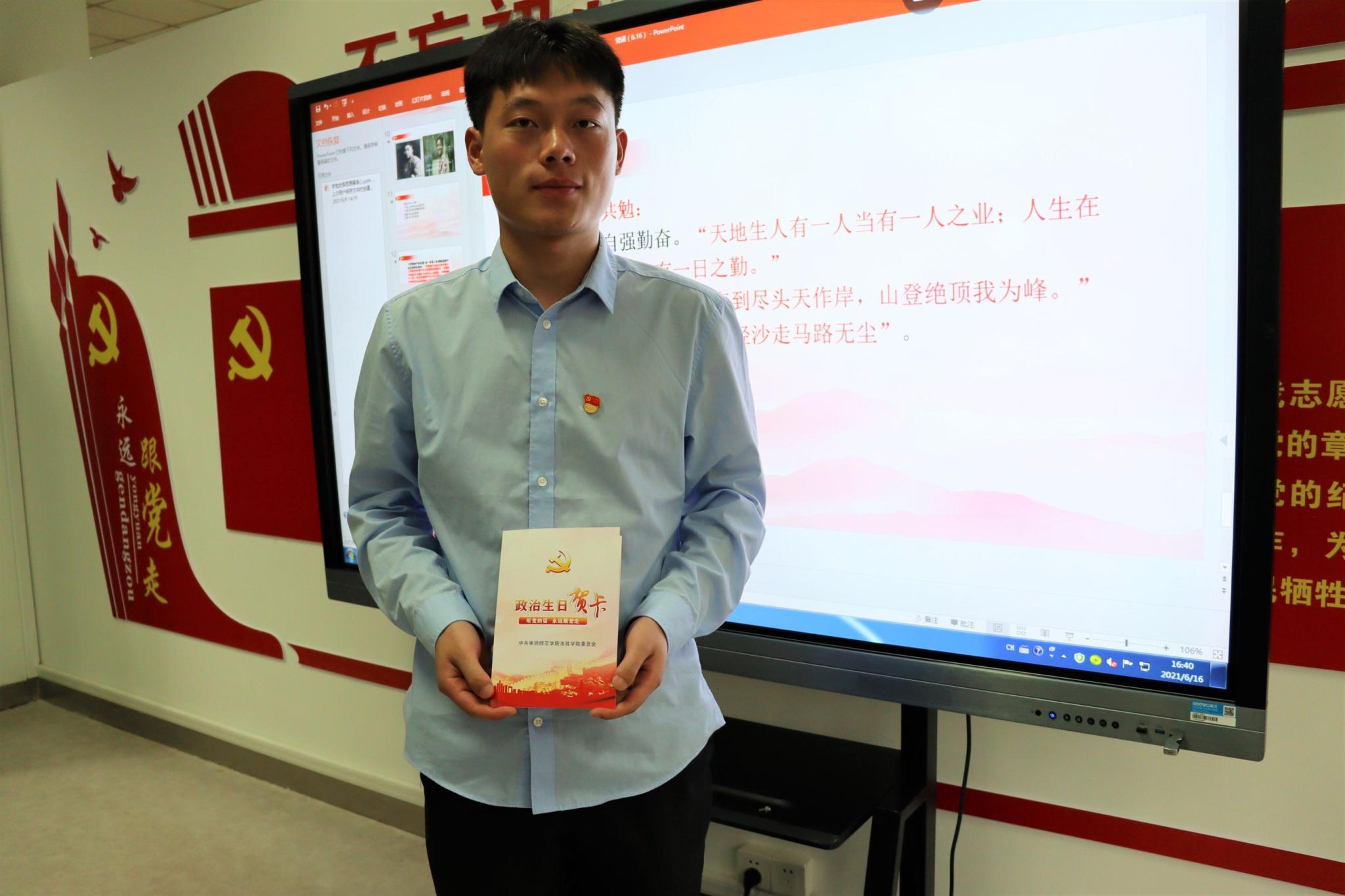 张秀芳为党员代表佩戴党徽,员工党支部书记陈晨、唐昕为每位党员发放了政治生日纪念卡。