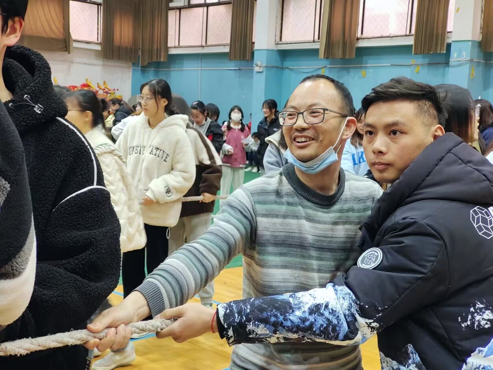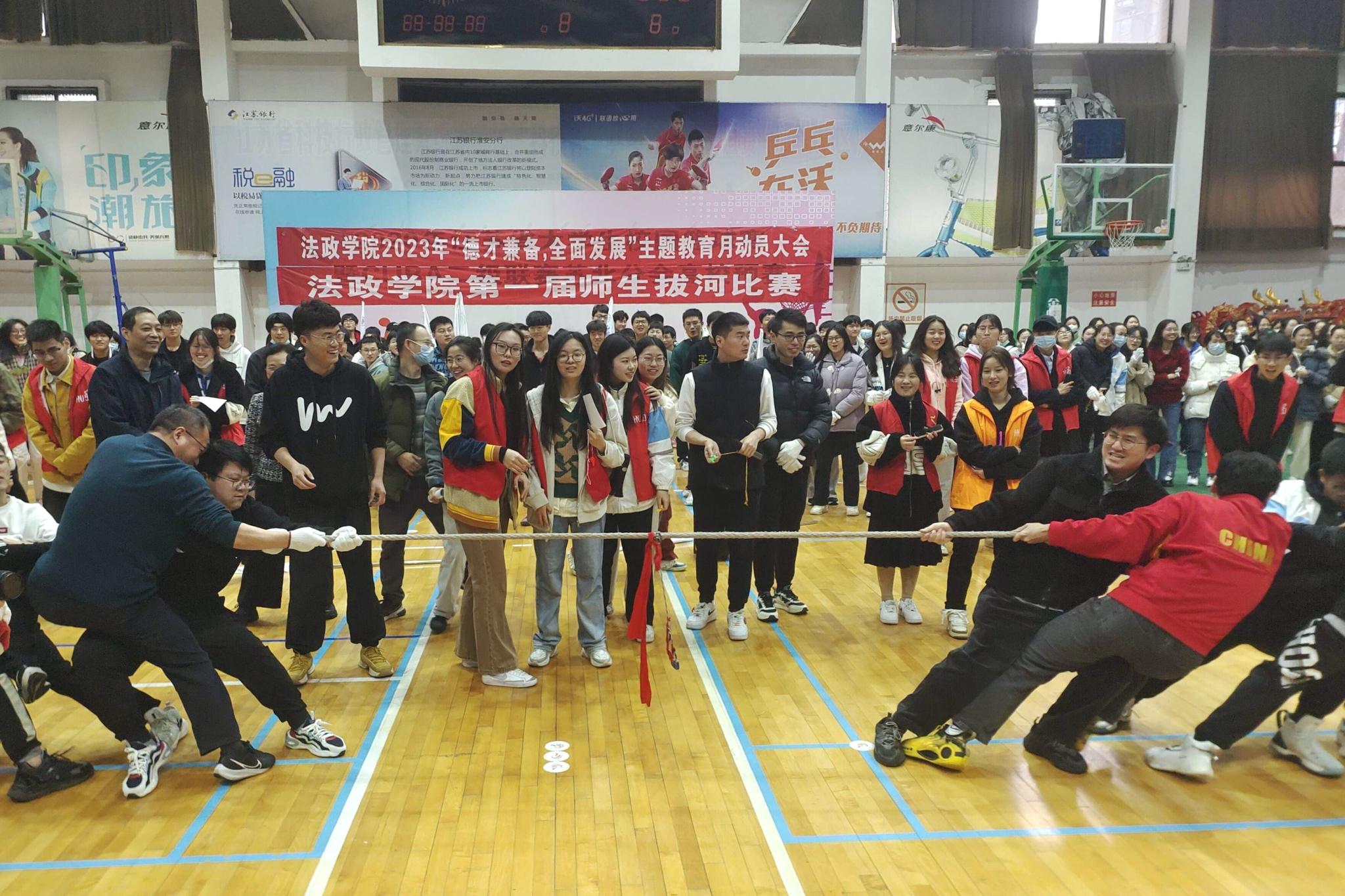 三载疫情拨云见日,大型体育活动迎来春天,助力老员工全面发展。体育馆内,法政师生齐力拔河,欢呼与呐喊沸反盈天,青春的张力激情飞跃。师生的情感交融,班级的团结奋进,体育的拼搏快乐都凝聚在绳子两端。