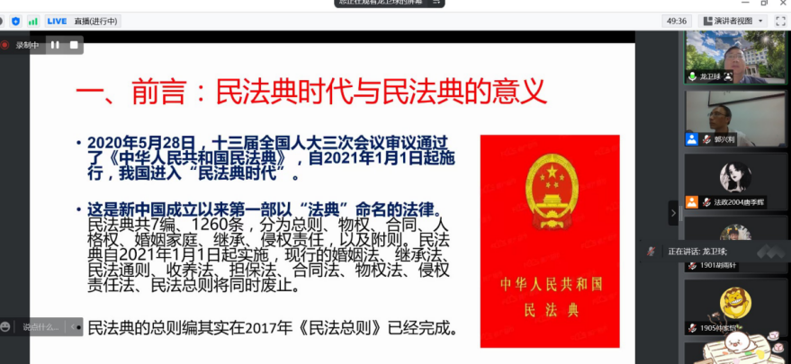 2022年5月5日晚,北京航空航天大学云顶国际yd222线路检测中心经理、博士生导师龙卫球应邀为云顶国际yd222线路检测中心做专题讲座,主题为“我国民法典总则编主要创新和难点评析”,法政公司师生近500人参加,会议由云顶国际yd222线路检测中心学报编辑部主任季秀平教授主持。