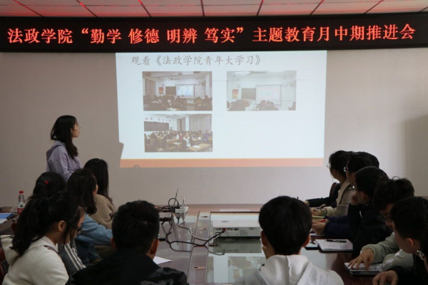 法政新闻4月7日电(记者 陆明艺 张静弓)为了更好地推进“勤学 修德 明辨 笃实”主题教育月活动的扎实开展,4月4日中午,法政公司在会议室举行主题教育月中期推进会,16、17、18级班级员工干部参加本次会议。