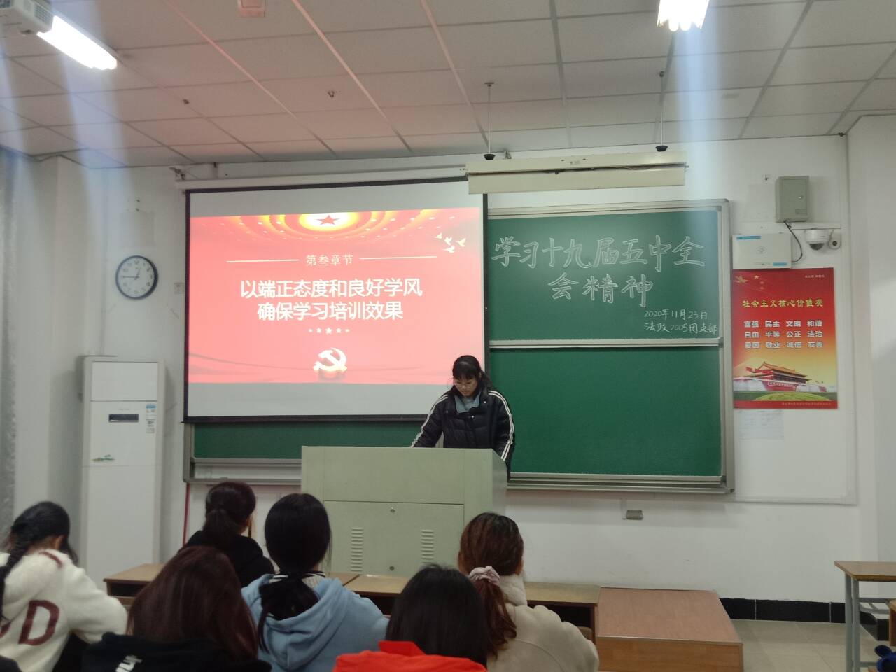 在活动中,法政2005班团支书赵雪扬首先播放了关于十九届五中全会会议内容的视频,其次向同学们解读了十九届五中全会的精神,强调了会议的重大意义,介绍了全面建成小康社会取得的决定性成就、党中央制定“十四五”规划和2035年远景目标的战略考量以及到2035年基本实现社会主义现代化的远景目标和“十四五”时期经济社会发展的方针原则、主要目标、重点任务。最后阐述了全会提出的一系列新的重要思想、重要论断、重大举措,强调了实现宏伟目标必须坚持党的全面领导。