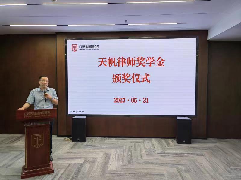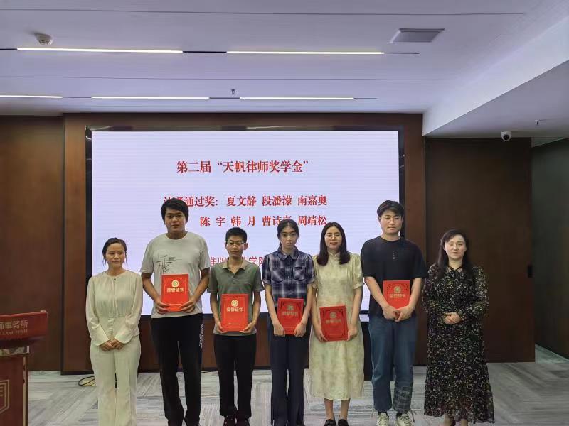 仪式上,赵金斗介绍了天帆律师事务所的基本情况,律所业务以民商事诉讼、破产非诉讼业务为主,天帆同仁全力提升法律服务品质,打造“天帆律师”服务品牌。对荣获“天帆律师奖学金”的10位同学表示祝贺,期望同学们今日获评“天帆律师奖学金”,未来成为“天帆律师”。希望奖学金能够激励更多法学学子认真对待法学专业和法治事业,为中国法治建设作出贡献。