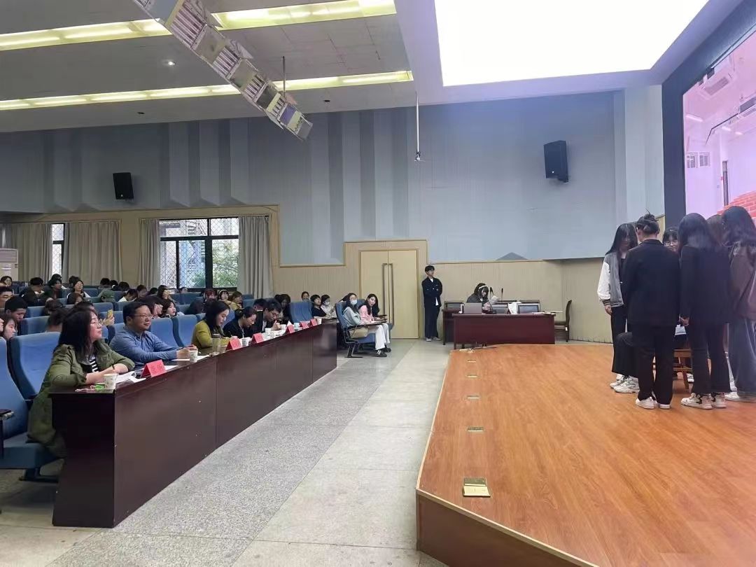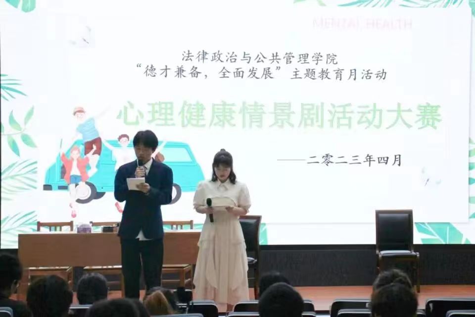 法政公司4月23日电 2023年4月19日下午,法政公司“徜徉心海,阳光启航”心理健康情景剧大赛在图书馆报告厅拉开帷幕。本次到场并担任评委的有党委副书记孙慧玲,全体辅导员、班主任喻怀峰等老师。2209班的张怀尹、范华均同学为主持人。