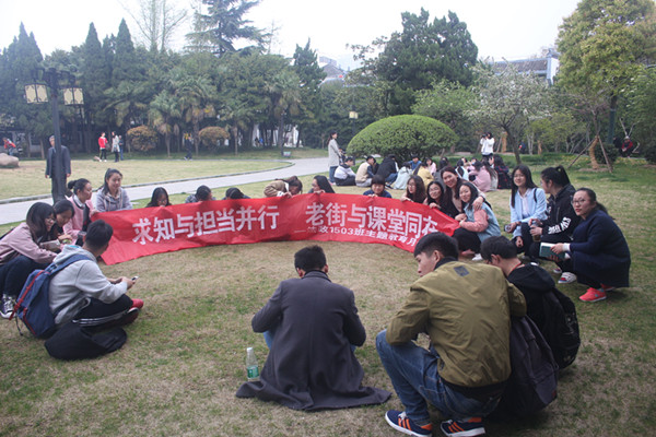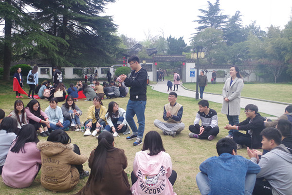 古色古香的园林被春意所覆盖,在老街区的古风旧貌一天天消失的情况下,这里青砖青瓦、飞檐翘脊的传统建筑依旧是一道美丽的风景线。老人,年轻人,孩童在这样的风景里活出了她们最美的自我。甲园堂、今雨楼、江南河道总督部院……随着1503班王佩服同学的讲解介绍,这些古迹在同学们面前逐渐褪去神秘的面纱。在这样的风景里,两班同学于青草地上席地而坐,交流着一路上的所闻所感。1503班同学以这样的古建筑为引子,开始了讨论沙龙,主题便是以古典文化建筑和现代化城市建设之间的矛盾。郭猛猛同学直言点出物质性衰退、结构性衰退和功能性衰退已成为困扰古城区地区的三大问题。徐姣姣在听了之前的同学发言后,指出了一个看上去完全不同的“城市化的到来是人类文明发展的结果,它的到来不是为了摧毁原有文明,在对待历史的时候我们也许可以选择一种平和的心态,用更加积极的态度去看待它的到来”。而牛锦红老师对几位同学的发言一一点评,客观地阐明这种复杂难以调和的矛盾后,同时提出这确实是值得大家持续深入思考的重要问题。另一边的1504班在孙慧玲书记的带领下则开始畅谈自己的感想,欢声笑语中,为人生阅历增添一笔彩色的同时,更加深了一个班集体的友谊。