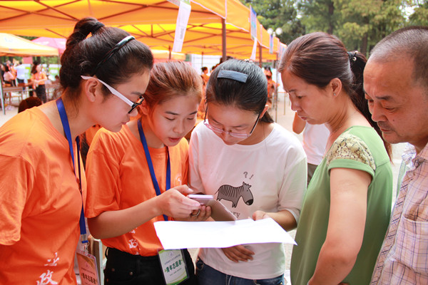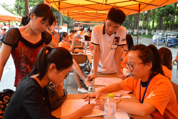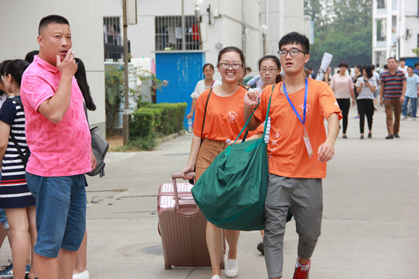 图为新生到来时的场景以及志愿者的合照。 记者 张安琪 杨浩波 王煜 摄