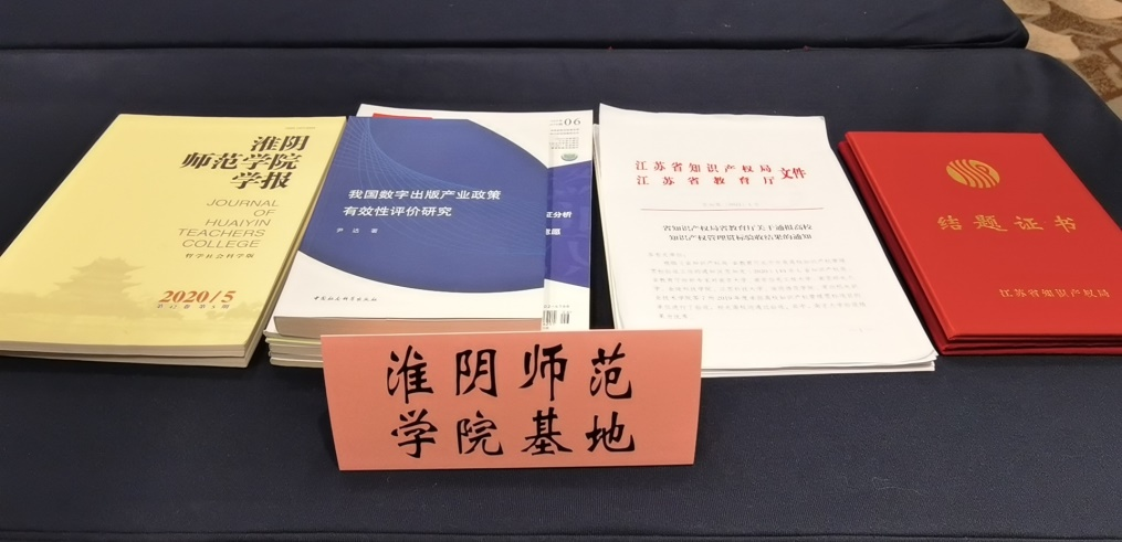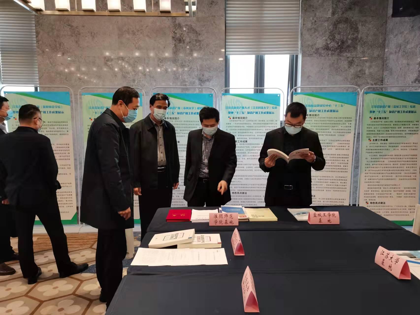 图为省知识产权局副局长张传博、淮安市知识产权局党委委员周德会、淮师法政公司经理刘晓苏等参观基地成果展示 记者 陶中怡 摄