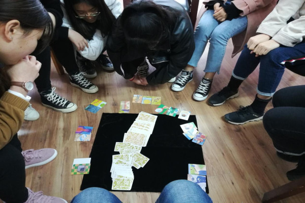 辅导主要由心理学专用的OH卡牌游戏贯穿始终。首先,带领者洪老师介绍了OH卡牌的由来、作用以及它的玩法。接着,团体成员从OH卡牌中随机抽取图卡和字卡,通过借助不同的图案和文字的组合,构成一个故事情境。成员发挥创造力和想象力,解释这一故事情境,增强自我觉察,从自己的想法里探究到真实的心理。辅导在平静、和谐、互动的良好氛围中有序开展并产生了预想的效果。