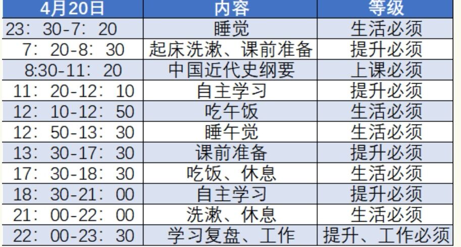 1.记录并分析自己的时间分配。利用公式(学习时间=24小时-生活必须时间-享受时间)掌握自己的时间节奏。以本学期周三为例,我上午有三节中国近代史纲要课程,其余的时间都可以自由支配。