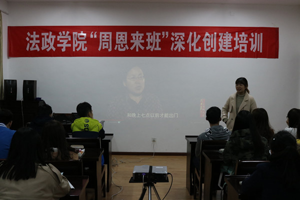 法政新闻3月19日电(记者 何燕潇 李霞 贾成洋)为帮助法政公司更好地学习恩来精神,更加积极开展周恩来班的培训活动,提高各班级创建周恩来班积极性。3月19日晚七时,法政公司于文通楼412室开展“周恩来班深化创建”培训。15、16级各班骨干准时到场,团委副书记金羽茜组织同学进行学习。