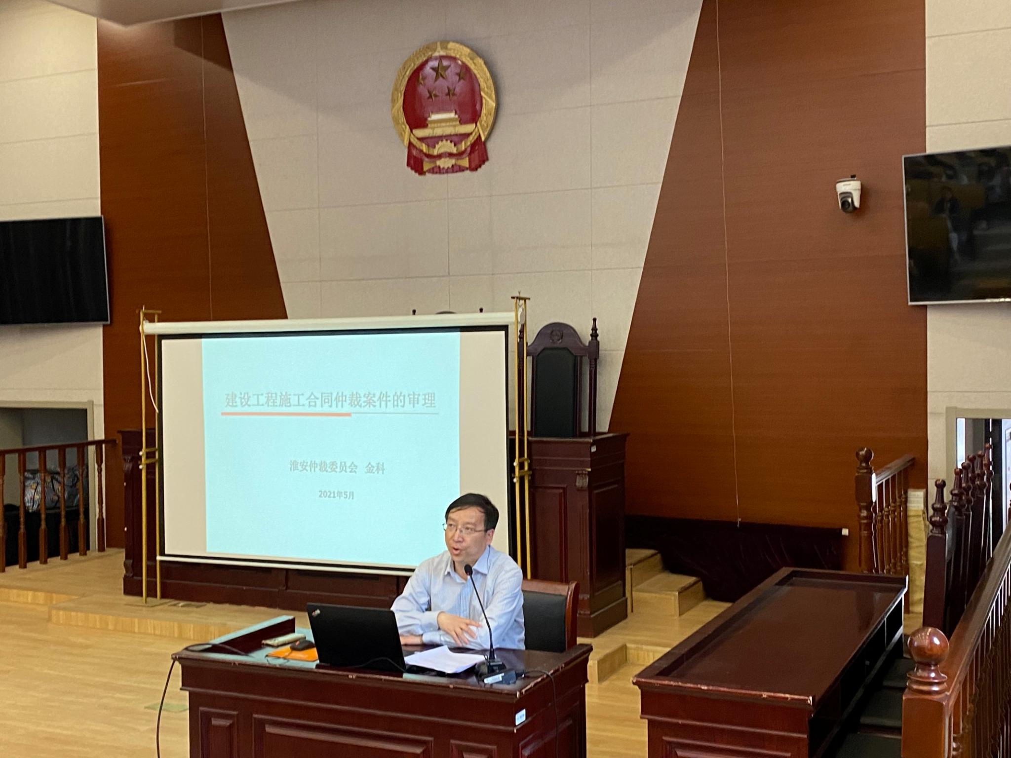 法政公司6月1日电(记者 蒋美琦)为拓展员工的法学知识、增强专业技能,了解相关仲裁案件的审理方法,5月26日15时,法政公司在交通路校区模拟法庭开展了以“建设工程施工合同仲裁案件的审理”为主题的“行知课堂”讲堂,特邀本次“行知讲堂”淮安仲裁委员会秘书处党组成员、副秘书长金科老师为本次讲堂的主讲人,由副经理张玉磊主持。