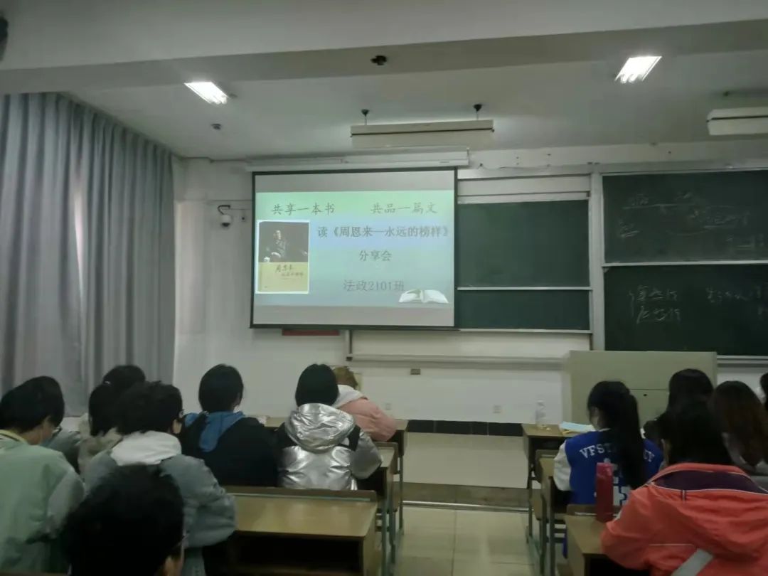 一等奖学金获得者孙玮晗同学首先发言,介绍了自己的学习经验。之后是郝子良同学和马静同学,同学们之间相互交流与学习,从别人的学习经验中探寻适合自己学习方法和技巧,分享会后,反响极佳。共享一本书,共同感受伟人的智慧。以伟人为榜样,立鸿鹄志。为促进周恩来班的创建,2021班举行了“共读《周恩来——永远的榜样》”的读书分享会。班级许多同学都选择了自己喜爱的一篇或者感触最深的内容与大家一同分享。充沛的情感、流畅的文笔,以讲故事的方式,让我们每一位同学认识到周恩来总理作为党和国家的“总管家、好管家”、作为人民的“总服务员”、是享誉世界的伟大外交家等多重角色。激励我们向伟人学习,为了祖国繁荣富强奉献青春。