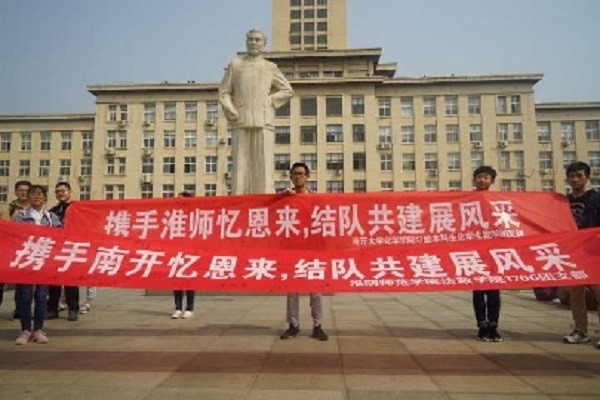 最后,两个班级在周总理的雕像下共同签署了共建“周恩来班”的协议书,拍照合影,相约在今后将长期开展交流活动。南开之行给了我们许多收获,我们从中感悟青年时期周恩来为“中华之崛起而读书”的决心。回到淮师,我们难以忘怀那段经历,5月3日,正值五四运动99周年之际,我们又举办主题班会,班级同学结合南开之行发表感言,同学们纷纷表示会努力践行周恩来精神,为实现中国梦而努力奋斗!