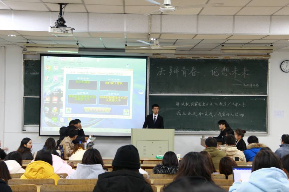法政公司12月1日电(记者 蒋美琦 朱薇舒)为了增强法政公司员工信仰力,引导其坚持用社会主义核心价值观凝心聚力,法政公司开展了“素养公开课”。11月29日晚7时,法政公司2001班,2002班以及2006班在综合楼阶梯教室201联合举办了“法辩青春,论想未来”辩论赛,本次比赛的主持人为法政公司的孙志远、郭芮含同学,并邀请了2002班班主任邹玉政老师、王慧芳老师和郭兴利老师为本次比赛点评,以及1901班的时云霄同学,1902班的洪懿婷、周琳宇、欧怡娜同学,1905班的朱嘉辉同学担当本次比赛的评委,本次辩论赛的辩题为“解决校园霸凌更应该从教育/法律入手”与“我应该选择爱我/我爱的人结婚”。