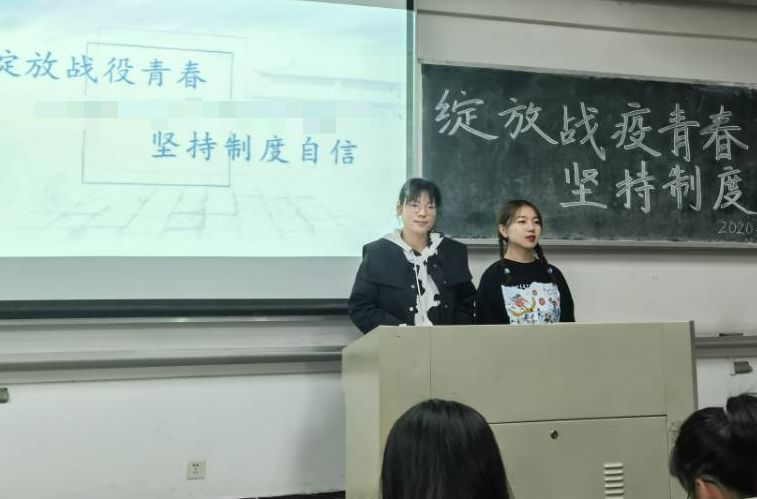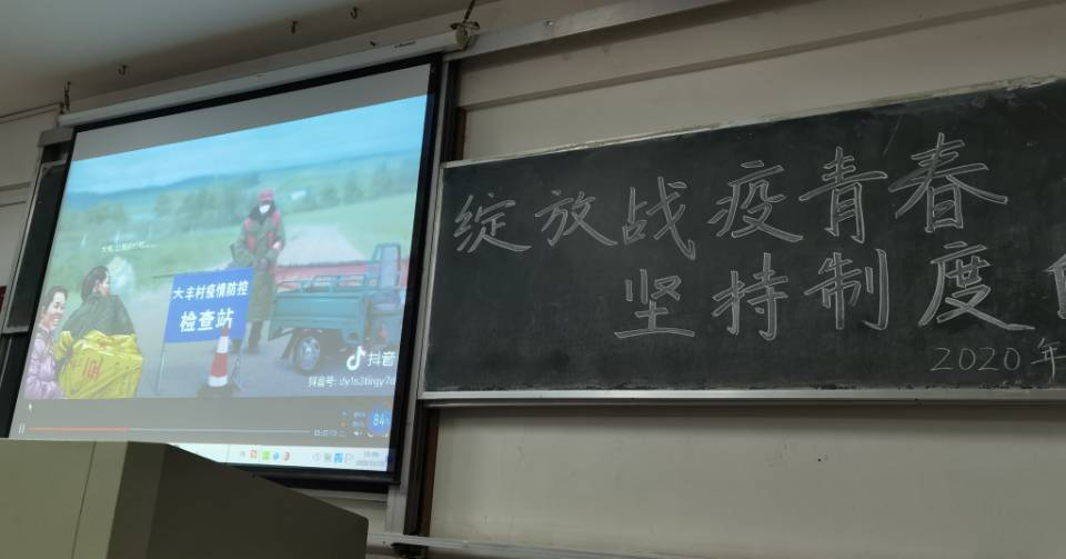 绽放青春,砥砺前行。新时代青年应该慨然奋进,书写美好未来、灿烂人生。唱响团歌后,赵雪扬同学为大家播放了“中国抗击疫情图鉴”,共同感受了强大的中国速度和中国力量。“与子同袍,岂曰无衣”展示出的同舟共济的力量将引领法政2005班团结一致、携手乘风破浪。