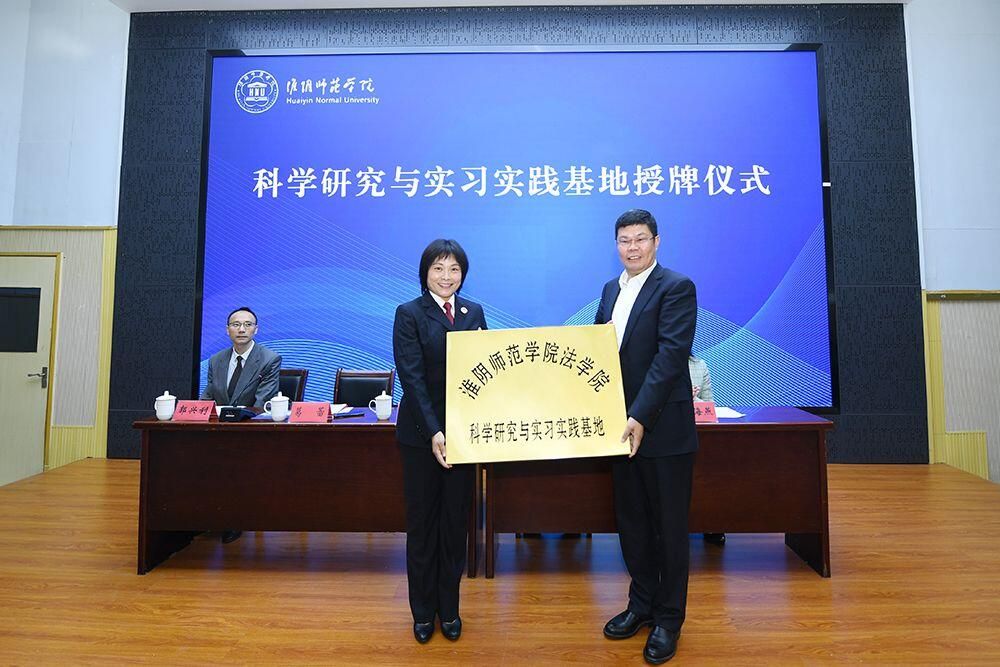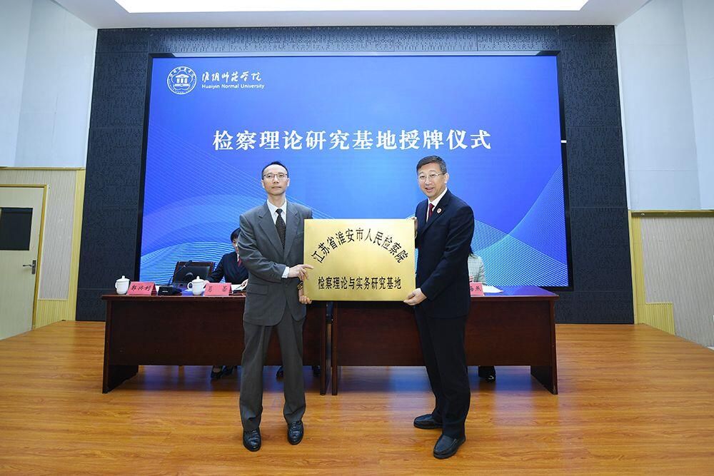 赵宜江为淮安市人民检察院授牌云顶国际yd222线路检测中心科学研究与实习实践基地。薛国骏为云顶国际yd222线路检测中心授牌淮安市人民检察院检察理论研究基地。