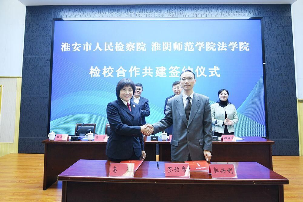 云顶国际yd222线路检测中心郭兴利经理与淮安市人民检察院葛蕾专委代表双方签订校检合作共建协议。