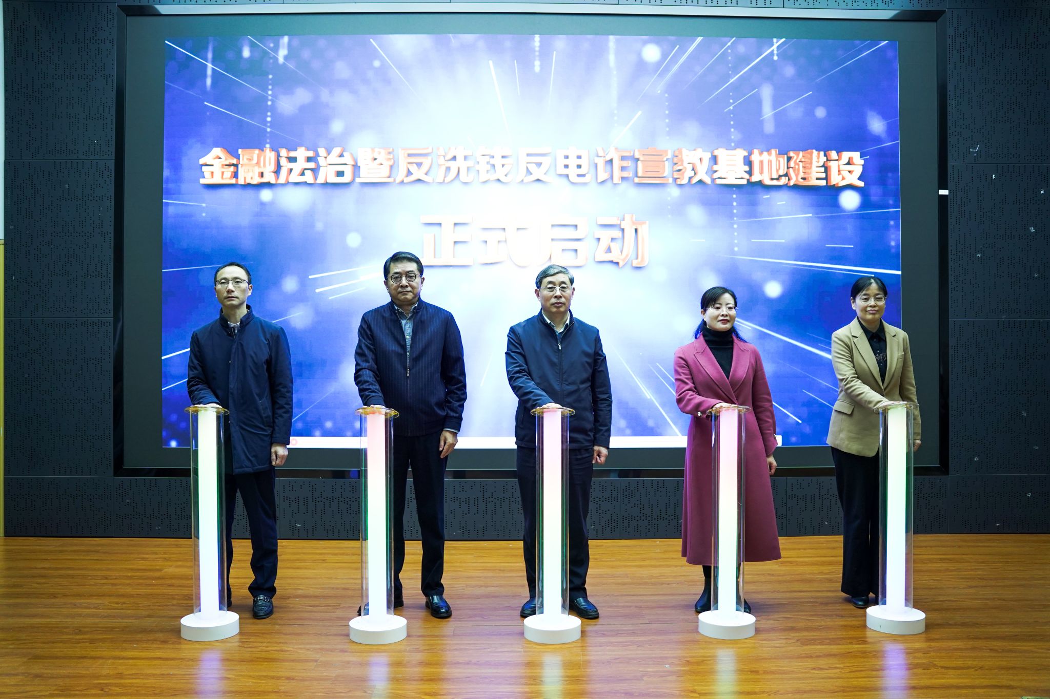 淮安市人民检察院刘月进、人民银行淮安市分行何纲、李萍、淮师云顶国际yd222线路检测中心谢海燕、郭兴利等领导共同为“金融法治暨反洗钱反电诈宣教基地”揭牌。