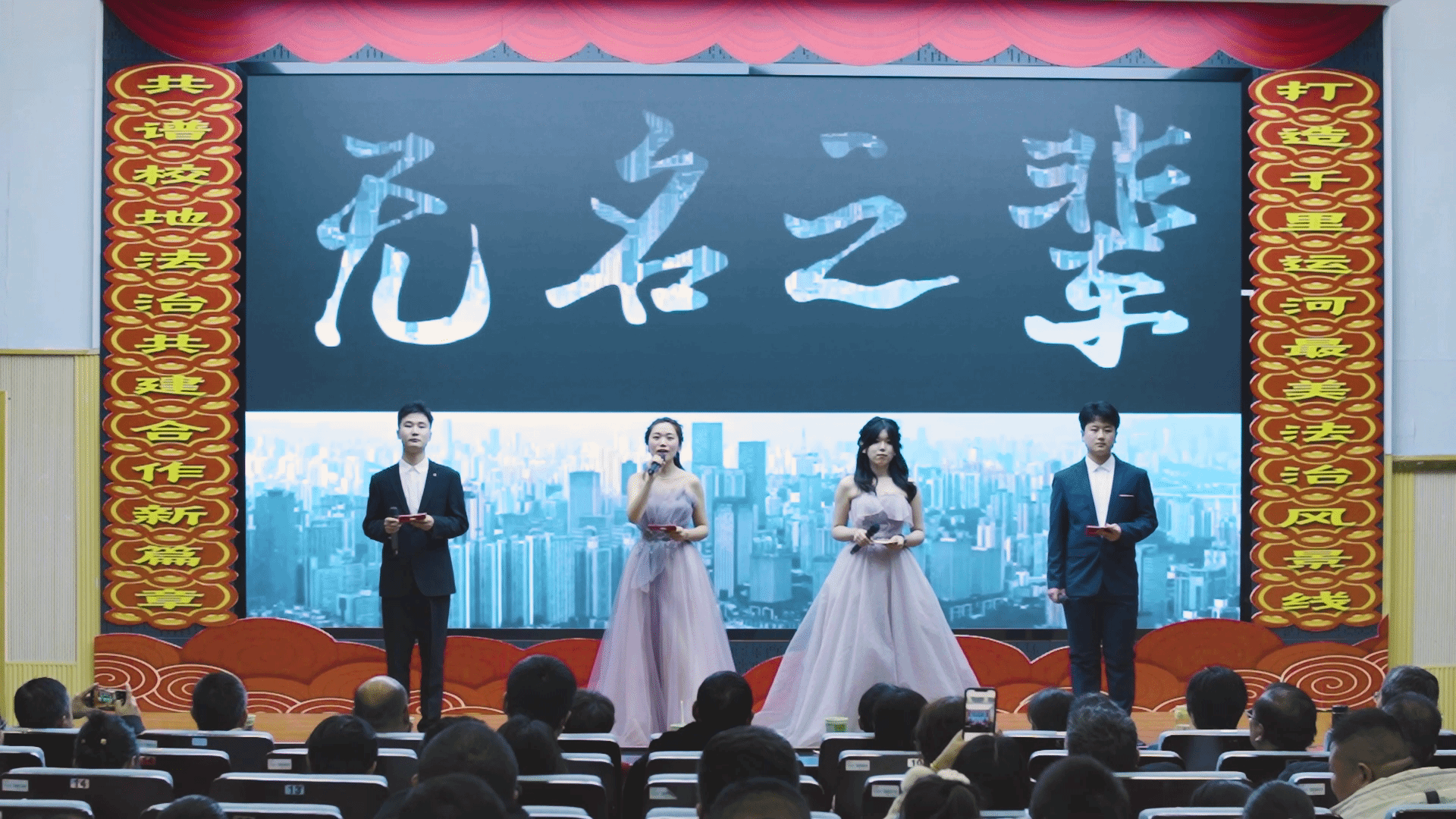 “无名之辈,我是谁,忘了谁也无所谓,继续追,谁的光荣不是伴着眼泪…”一段清江浦城市法治宣传片《法治那些事儿》之后,演出在主持人合唱的《无名之辈》中正式拉开帷幕。无名之辈,萤火虽微,愿为其芒。这条法治之路上有太多的感动与故事。诗朗诵表演《你的名字叫中国律师》讲述了清江浦律师赴西藏开展法律志愿服务的艰辛历程,他们用专业的精神和坚定的信念,将青春韶华融入新时代法治中国建设的进程中,他们在雪域高原播撒法治之种,绽放出同心格桑花。《一位法律工作者的独白》为我们讲述的是无数基层法律服务者的心声,他们或许默默无闻,但他们用法律服务帮助着更多的基层群众,带给社会更多公平正义,奋战在法治事业的第一线。