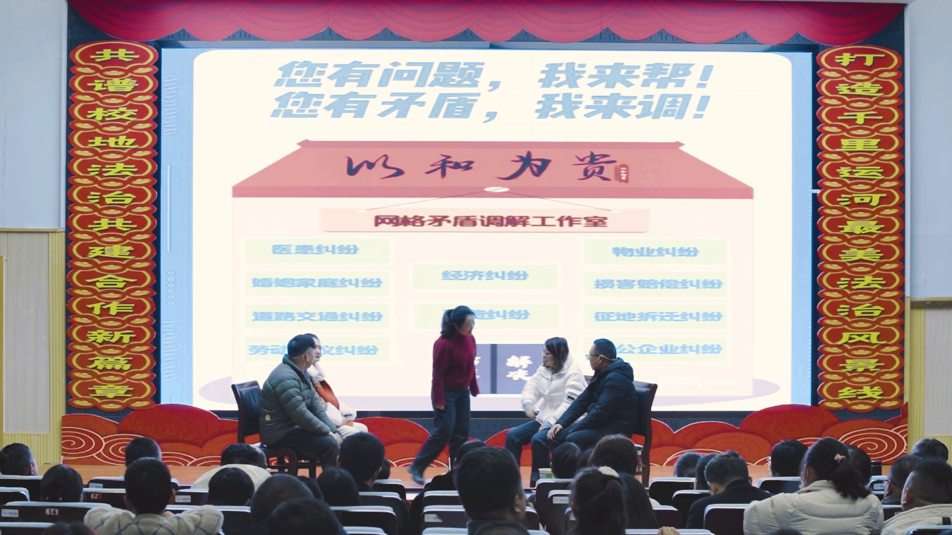 小品《一“网”情深》将网格矛调室搬上了舞台,为我们讲述了调解员断“家事经”的故事,调解中既说法也讲情,帮助一大家子和好如初、和和美美迎接新年。这也是全区26个网格矛调室的缩影,2023年,清江浦区司法局创新推动设立网格矛调室,为群众提供家门口的调解服务,送上法治温暖。歌舞表演《萱草花》由三对母女共同出演,打动人心的歌舞既是对法治事业薪火相传、蒸蒸日上的祝愿,也是对所有父母身体健康、快乐无忧的祝福。整场演出在大合唱《京腔戏韵法治情》中画上句号,一首具有清江浦地域特色的法治歌曲,生动展现主城区深厚文化底蕴底蕴与法治底蕴,传唱司法行政好声音、彰显司法行政暖民心。