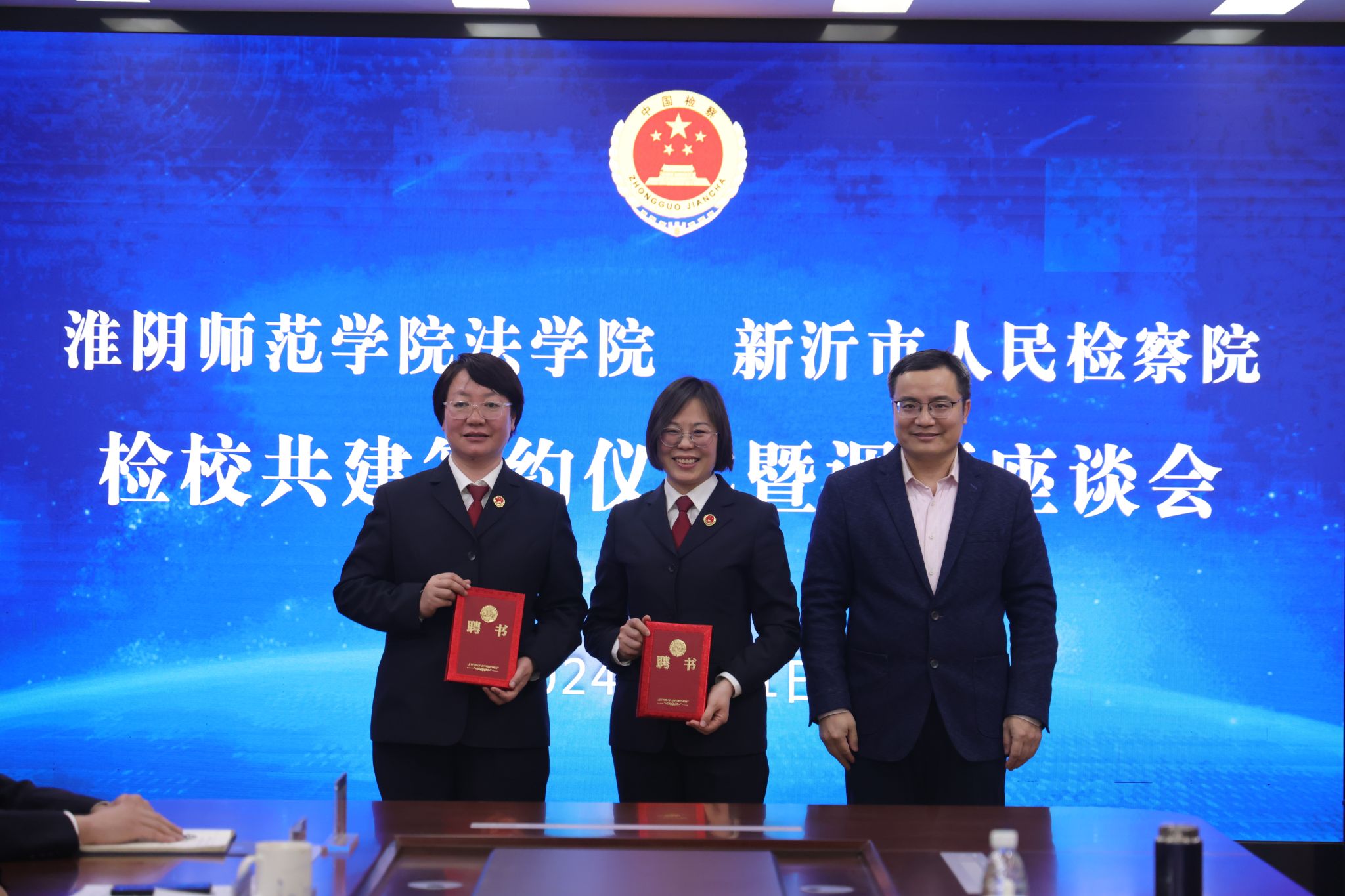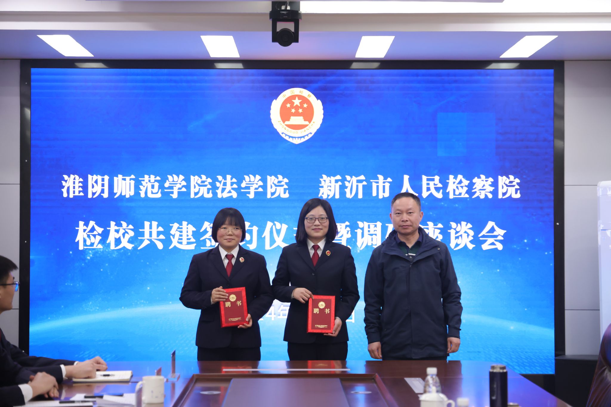 会上,郭兴利与吴浩代表校检双方签署“检校共建”协议书。李卓为在新沂检察院工作的员工陈丽梅、孙乾梅颁发就创业指导教师聘书。张洪成为新沂市检察院田晓晴、沈方颁发兼职教师聘书。