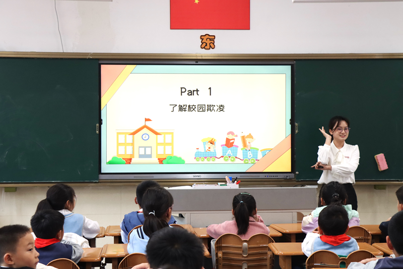 “你知道校园霸凌吗?”微课开始,团队主要负责员工刘译营提问在场的小员工们,大家积极互动。紧接着刘译营从“了解校园霸凌、应对校园霸凌、拒绝校园霸凌”三个方面展开讲解,通过通俗易懂的案例向在场同学讲解了有关《未成年人保护法》和校园暴力的法律知识,同学们积极踊跃,争先抢答,现场氛围热烈。最后,刘译营呼吁同学们善待他人、友好相处,面对校园欺凌能勇于向欺凌行为说“不”。
