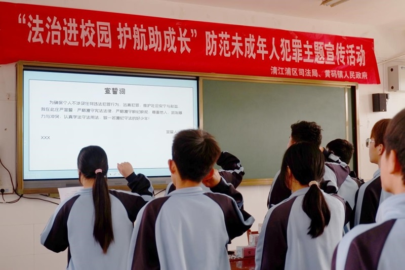 “为确保个人不涉及任何违法犯罪行为,远离犯罪,维护社会安宁与和谐,我在此庄严宣誓:严格遵守宪法法律,严格遵守校纪校规,尊重他人,抵制暴力与冲突,认真学法守法用法,做一名遵纪守法的好少年!”此次普法课在大家的集体宣誓中结束。