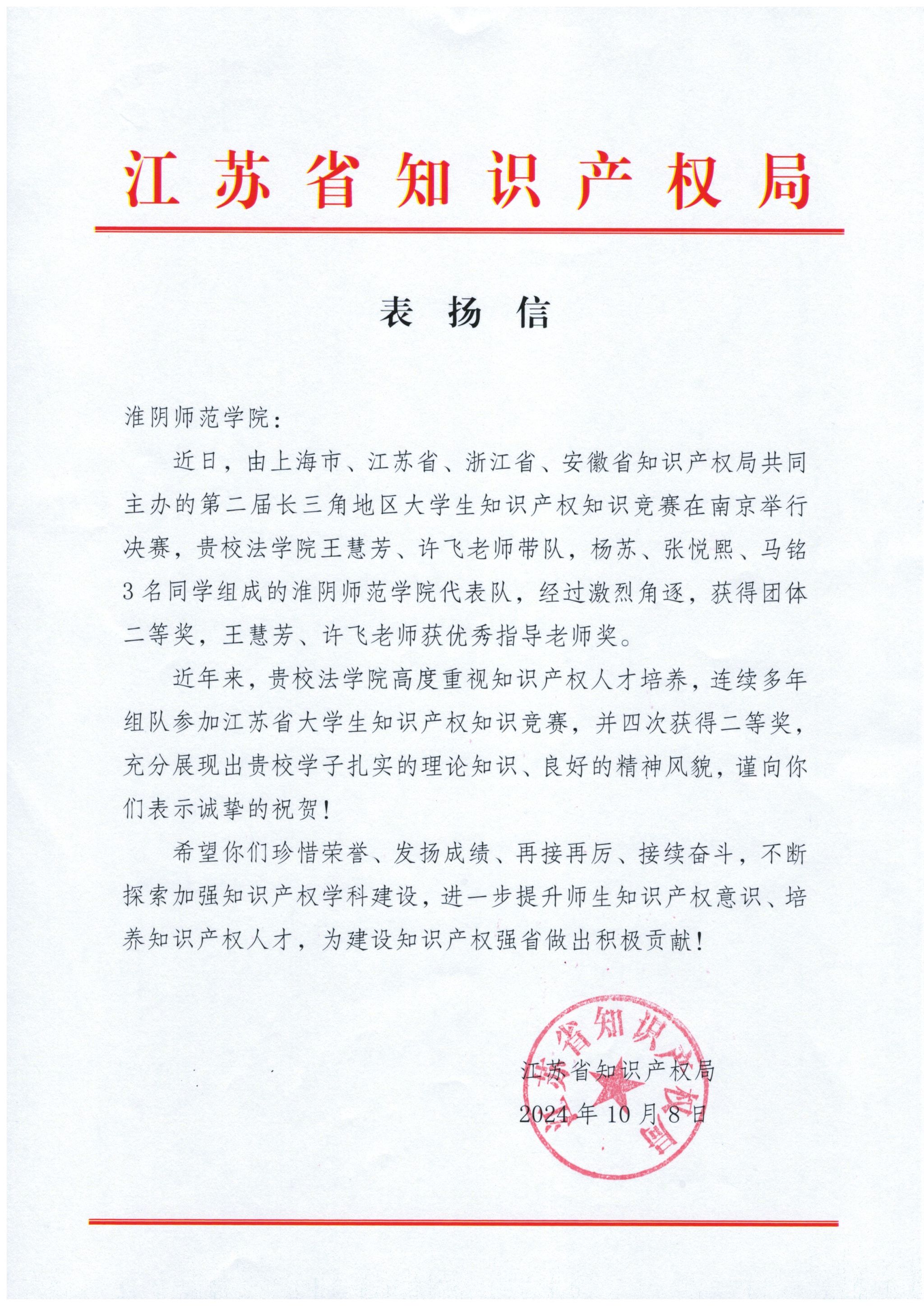 江苏省知识产权局表扬信