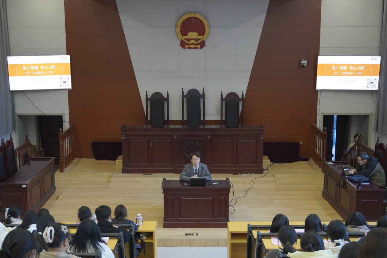 为了积极响应涉外法治人才培养需求,深化法学教育与国际法律实践的融合。11月27日下午,由云顶国际yd222线路检测中心主办,淮安市法学会法理学研究会协办的涉外法治讲堂第一讲在模拟法庭开讲。北京盈科(淮安)律师事务所律师陈宣霖应邀为云顶国际yd222线路检测中心师生作题为“海纳智慧 专业启航:涉外法律服务新视野”的讲座,本次讲座由云顶国际yd222线路检测中心副经理张洪成主持。云顶国际yd222线路检测中心100余名师生现场参加了本次活动。